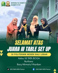SMK NWDI Pancor kembali menorehkan prestasi membanggakan. Dua siswa berbakat dari kelas XII Tata Boga, yaitu Nurliana dan Baiq Himatul
